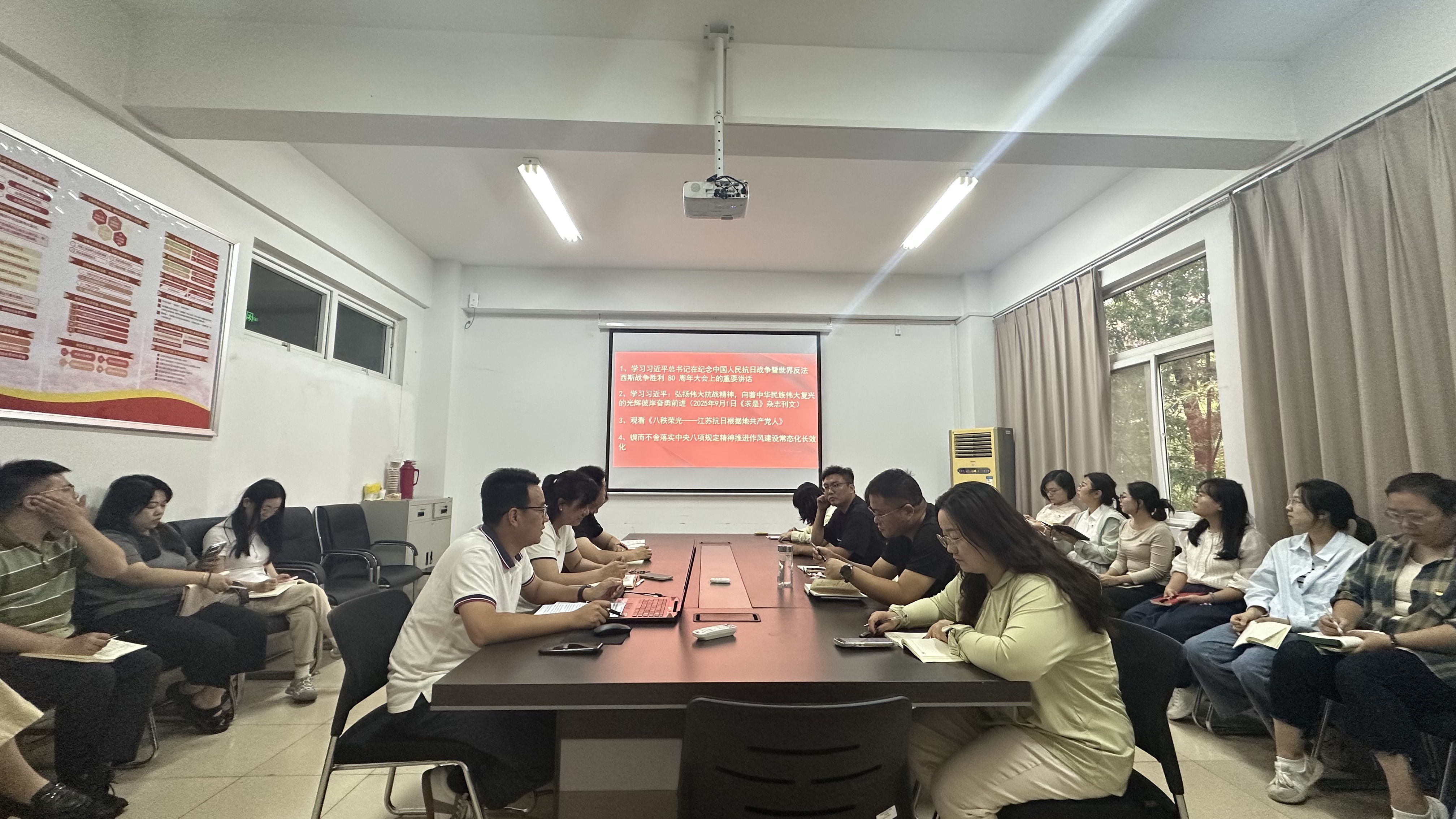 会上,朱翔带领全体与会人员深入学习了习近平总书记在纪念中国人民抗日战争暨世界反法西斯战争胜利80周年大会上的重要讲话。会议紧接着认真学习了弘扬伟大抗战精神,向着中华民族伟大复兴的光辉彼岸奋勇前进。通过学习,大家深刻领会了伟大抗战精神的丰富内涵与时代价值。为进一步增强学习效果,全体成员集体观看了专题片《八秩荣光——江苏抗日根据地共产党人》,从革命先辈的英勇事迹中汲取精神滋养和奋进力量。