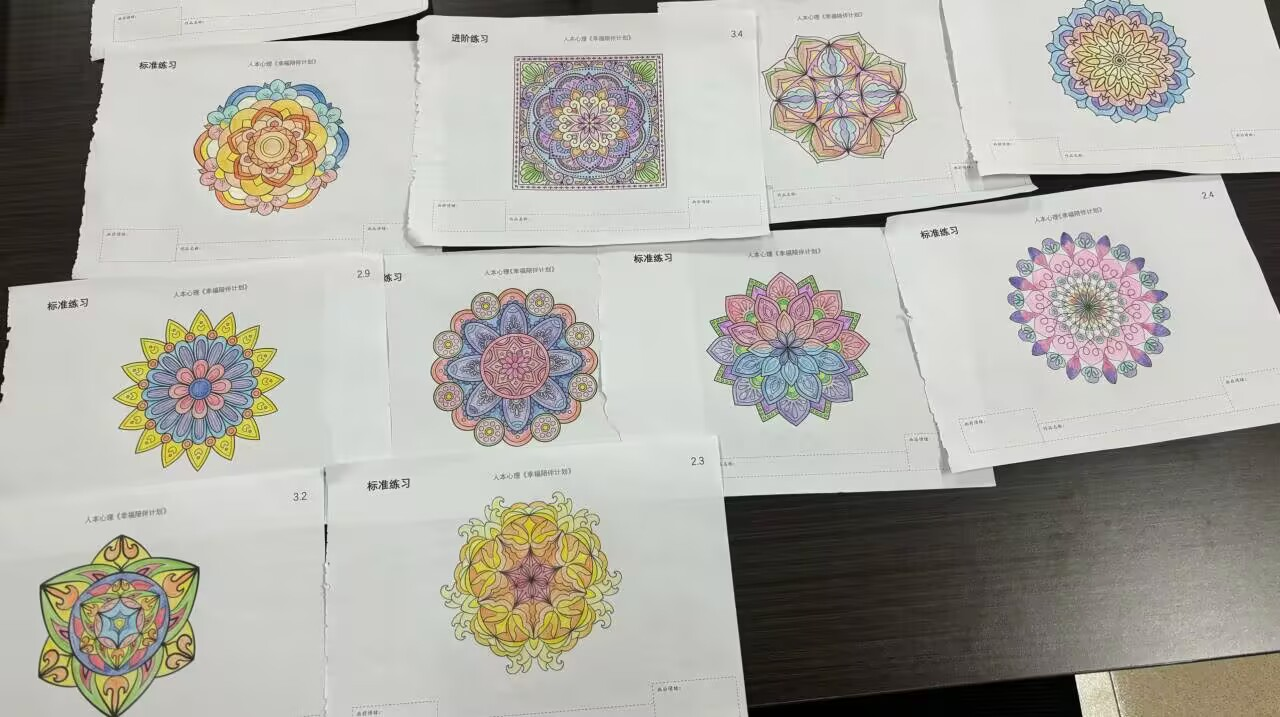 活动伊始,结合学生们“重逻辑、少表达”的特点,活动通过图文指引清晰呈现曼陀罗绘画的心理疗愈原理,无需专业绘画基础,只需跟着内心选择色彩、填充图案,就能在专注创作中梳理情绪。简单的绘画范例提前陈列展示,让同学们轻松放下画得好不好的负担,主动投入到自我表达的创作中。