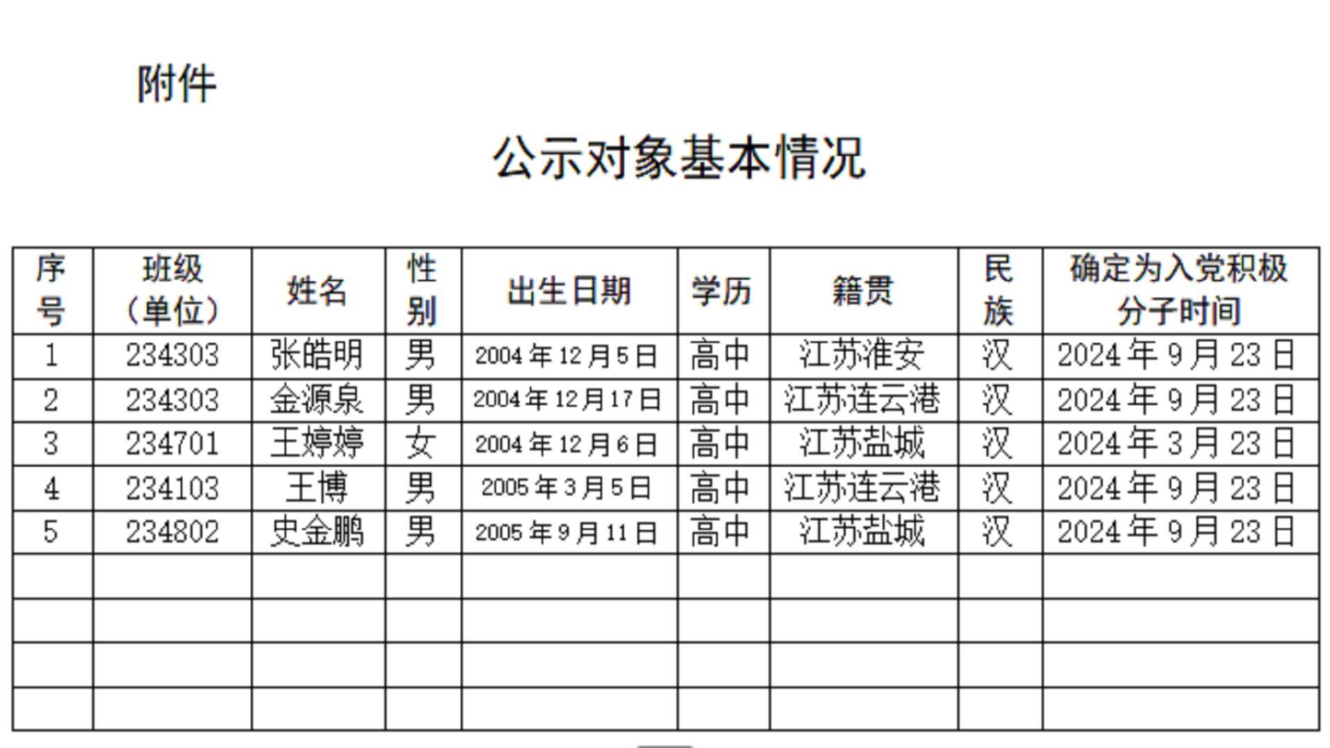 经党支部培养教育和考察,在听取党小组、培养联系人、党员和群众意见的基础上,经支委会2025年10月16日讨论,拟确定张皓明、金源泉等5位同志为发展对象。根据发展党员工作有关要求,现将其有关情况予以公示(见附件)。