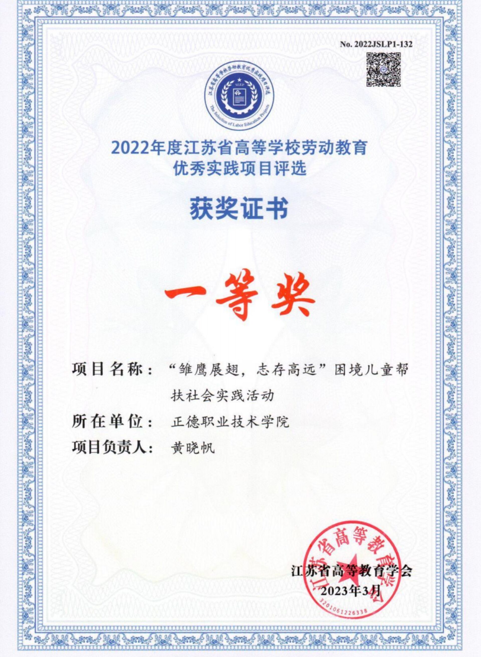 为全面贯彻党的教育方针,努力构建德智体美劳全面培养的教育体系,推进劳动教育实施,总结推广先进经验和有效做法,江苏省高等教育学会在省教育厅指导下,面向全省各高校组织开展2022年度江苏省高等学校劳动教育优秀实践项目评选,经学校推荐、专家会评,betway必威申报的《雏鹰展翅,志存高远—困境儿童帮扶社会实践活动》项目荣获一等奖。