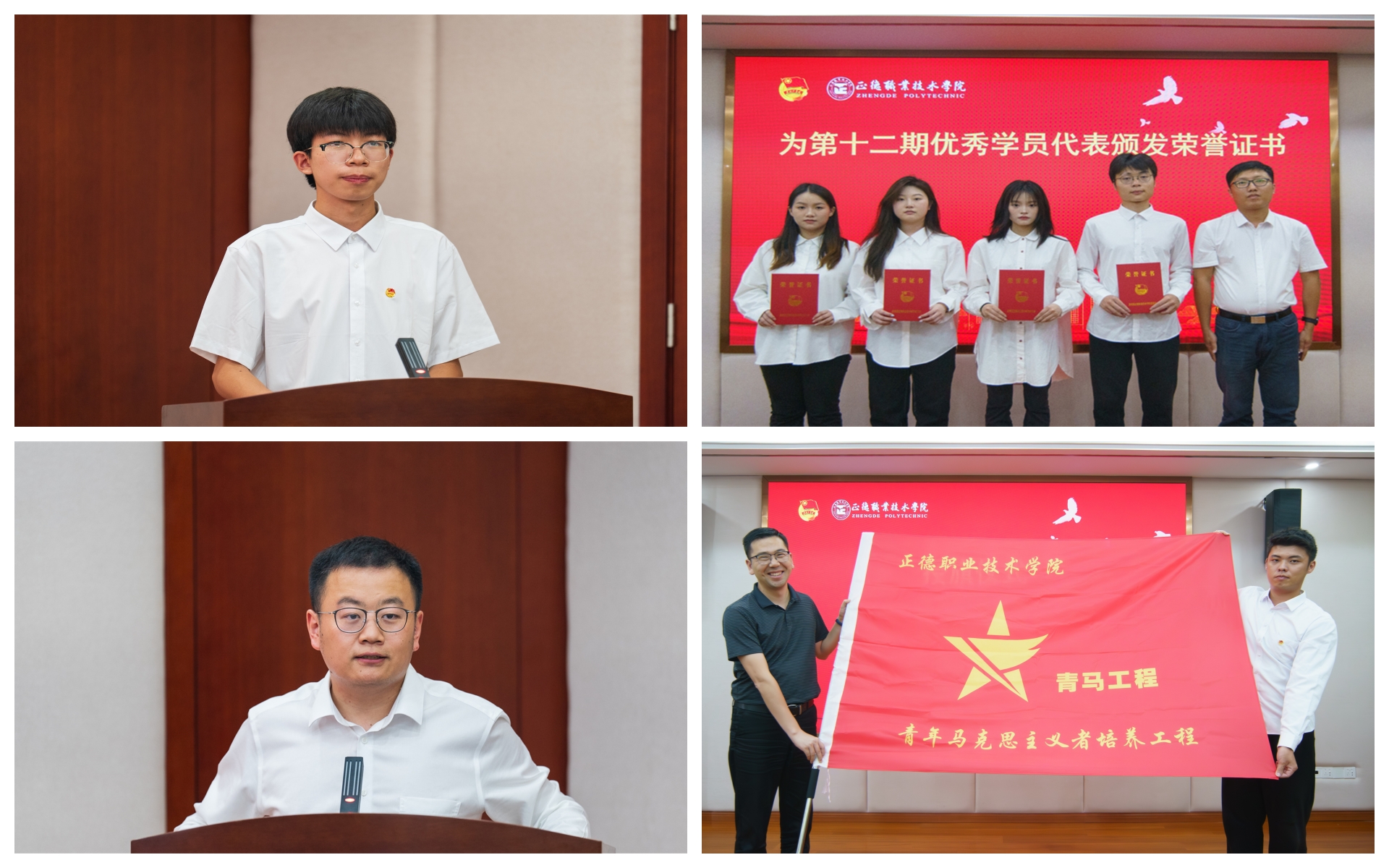 电子与信息技术系魏宇同学代表第十三期青马学员作表态发言,黄晓帆介绍了第十三期培训班培养方案及考核办法,祝佳俊为第十二期青马优秀学员代表颁发荣誉证书,祖国为第十三期培训班授旗。