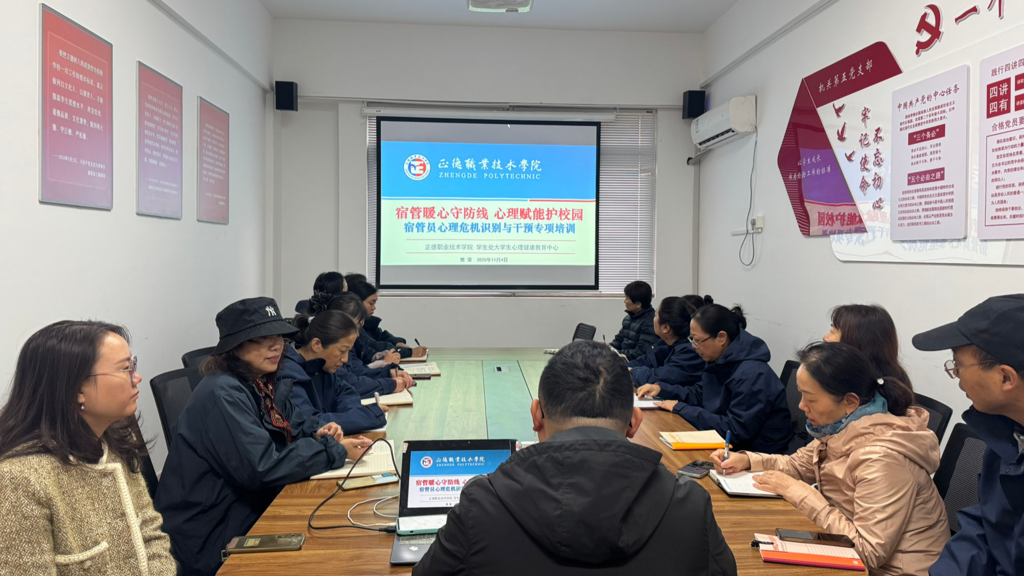 为进一步强化校园心理育人的协同配合机制,切实提升宿舍管理员对学生心理危机的识别精度与应对能力,充分发挥宿管队伍在基层育人工作中的“前哨”作用,11月4日上午,学生处组织开展2025年秋季学期宿管员心理危机识别与干预专题培训会。会议由学生处副处长何华智主持,心理中心教师樊荣主讲,物业管家和全体宿舍管理员参加。